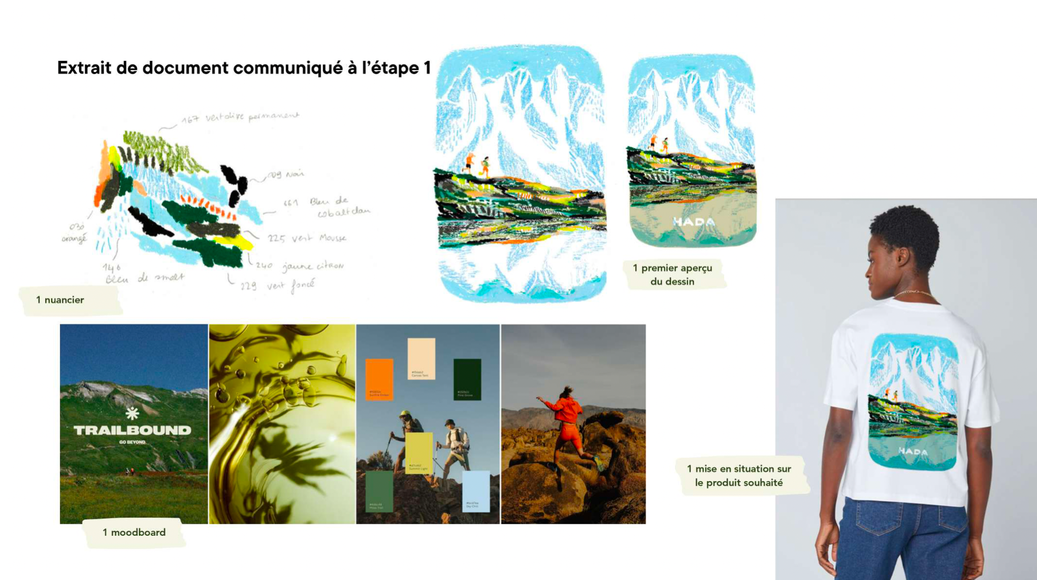 Vous trouverez dans ce document : un moodboard, un nuancier (ou deux selon le brief initial), un premier jet de l'illustration et une mise en situation sur le produit souhaité.